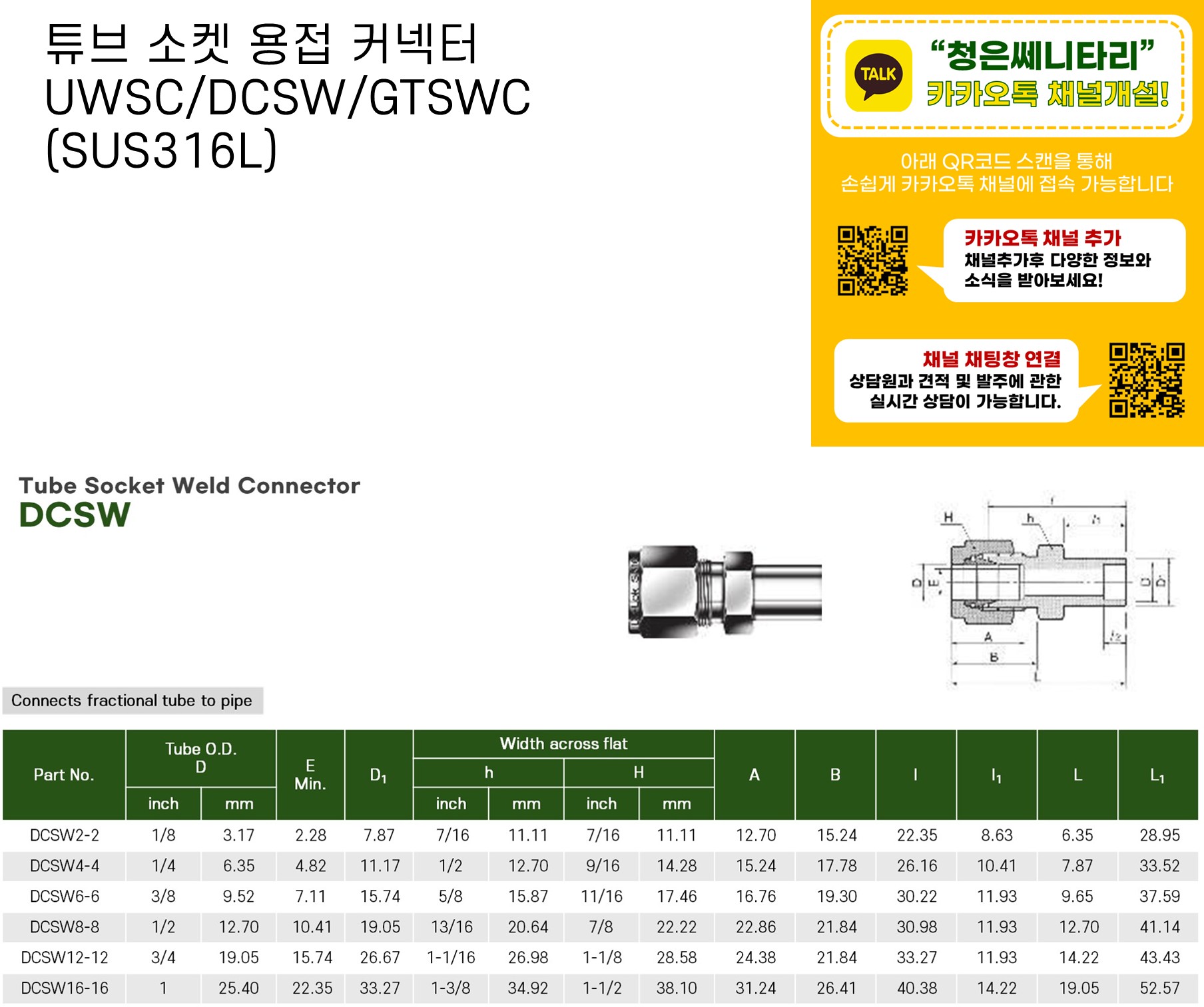 튜브 소켓 용접 커넥터 UWSC/DCSW/GTSWC (SUS316L)